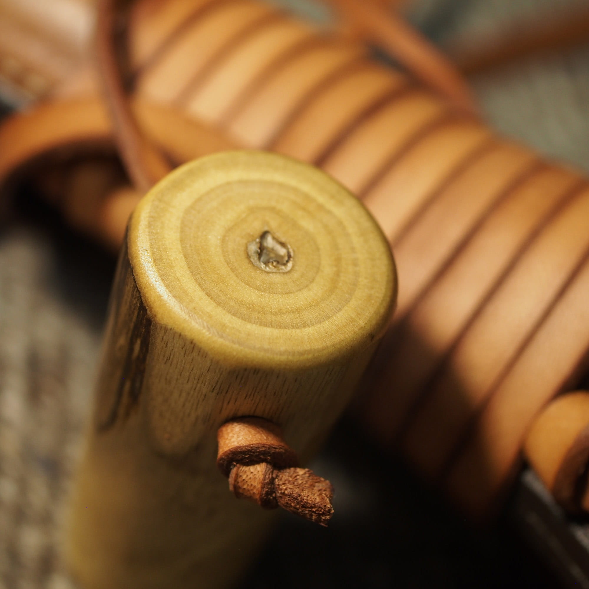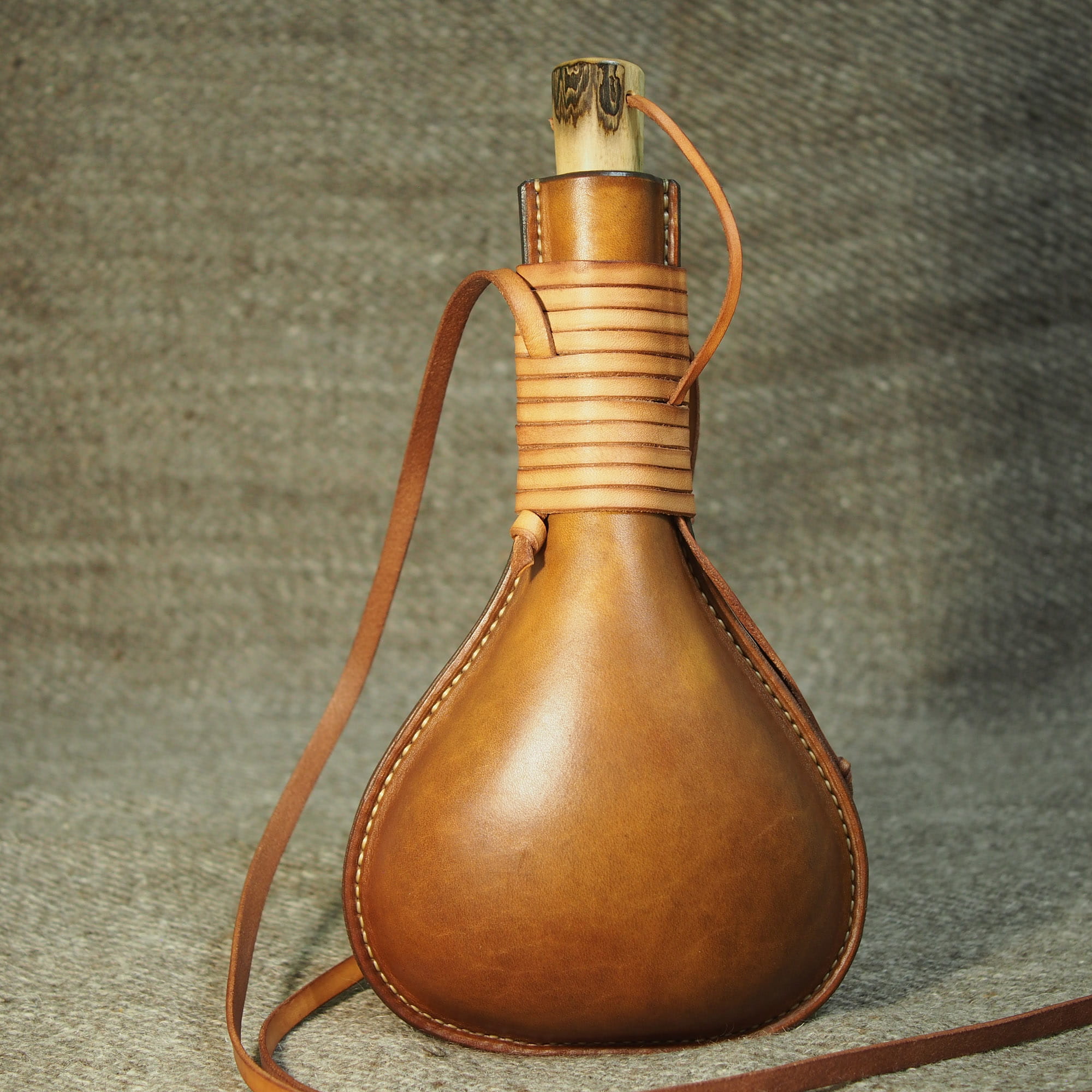 Duży bukłak na rzemieniu o pojemności ok. 0,75 l z drewnianym korkiem.