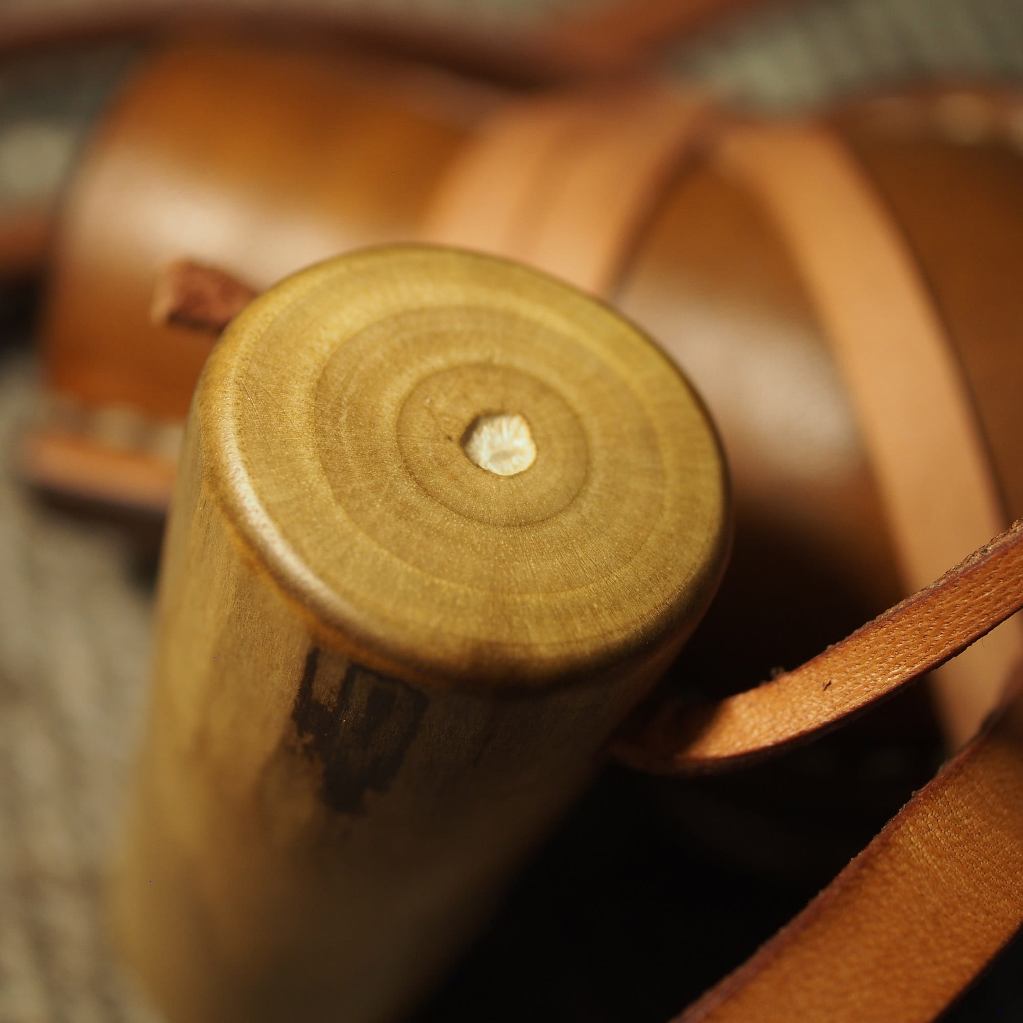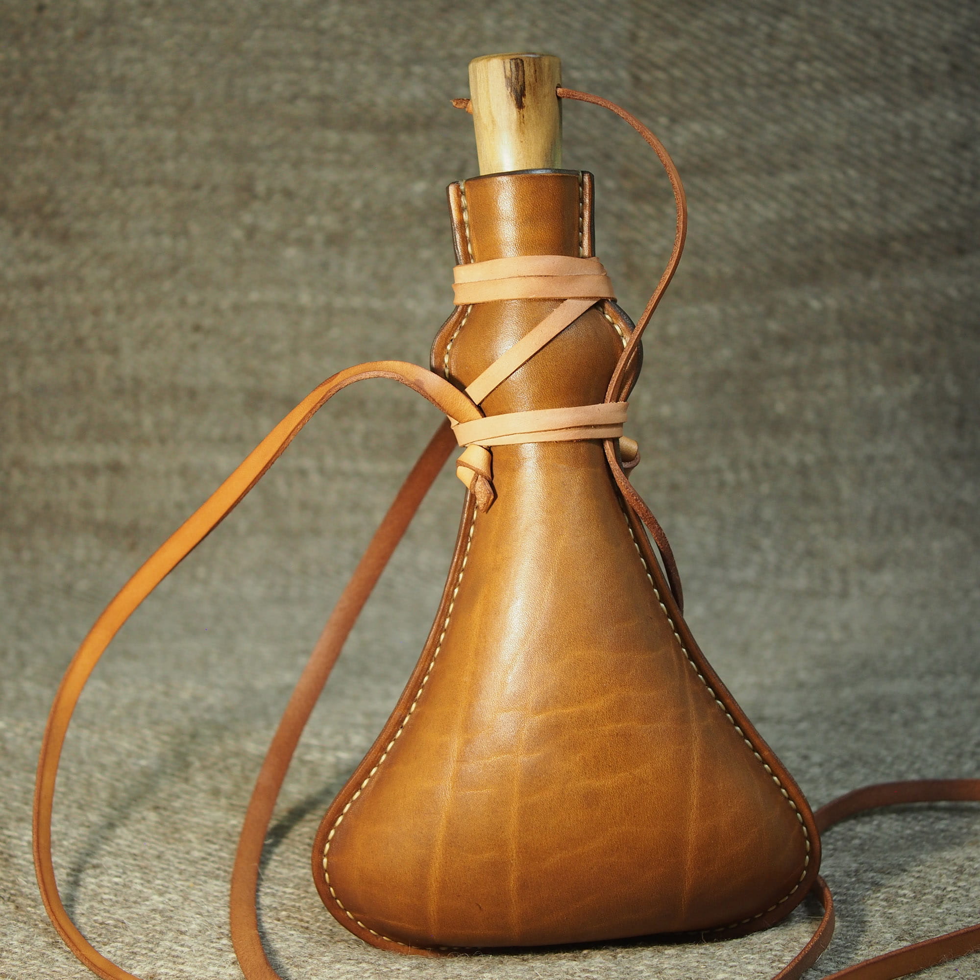 Średni bukłak na rzemieniu o pojemności ok. 0,7 l z drewnianym korkiem.